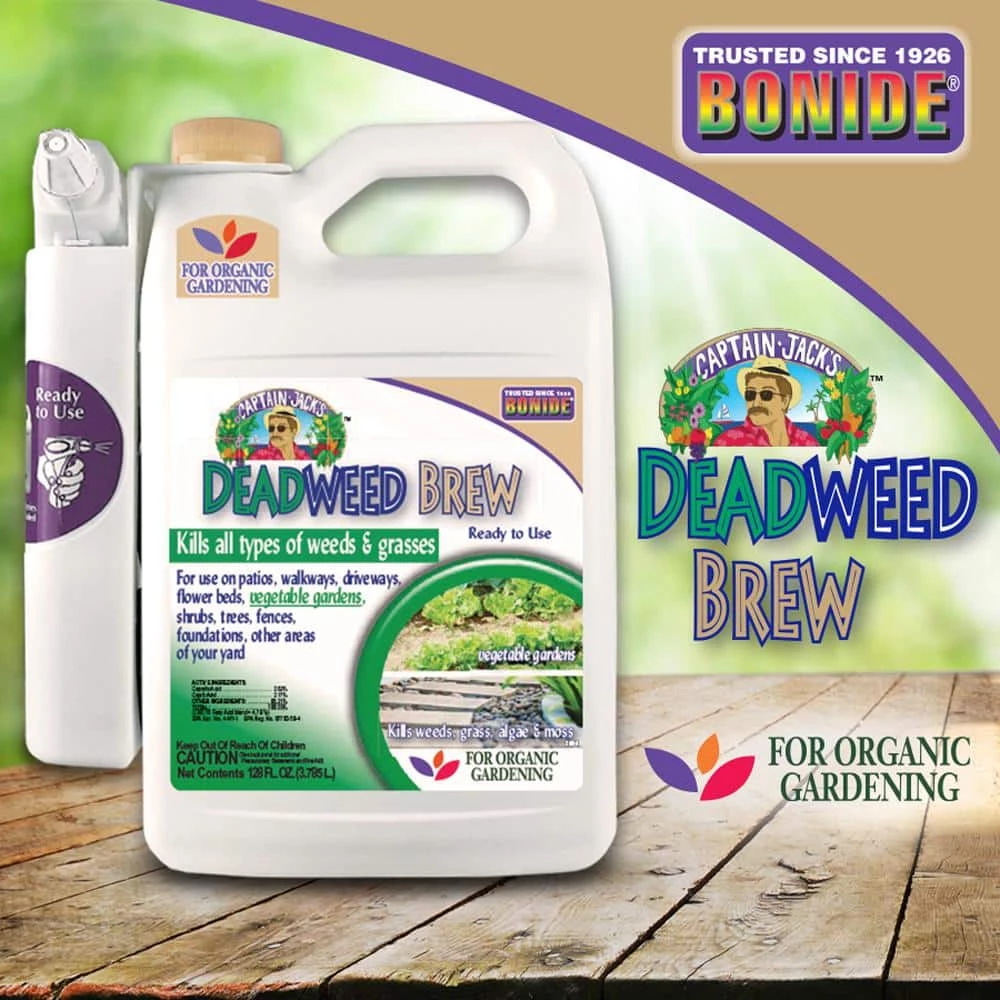 Our herbicide provides fast-acting control of weeds, grass, mosses, and algae within hours. Captain Jack’s Deadweed Brew is great for use on visible weeds within vegetable and flower gardens, landscaped areas, and lawns. It can also be used on visible weeds around and on buildings, sidewalks, fences, bark mulch, driveways, patios, and gravel. Approved and suitable for all of your organic gardening needs.