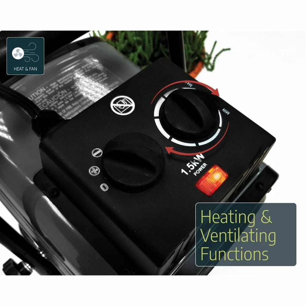 - Largest air output and heating cell in the 1500-Watt Greenhouse heaters market 233 m³/h. based on 43-Watt durable fan equipped with bearing suitable for humid environments