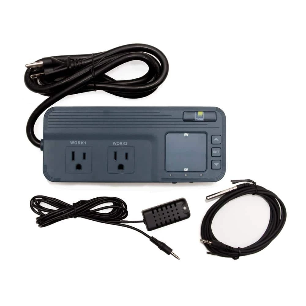 - 15 Amp 1800-Watt digital thermostat and humidity controller (15 Amp x 120-Volt equals 1800-Watt) for summer and winter use