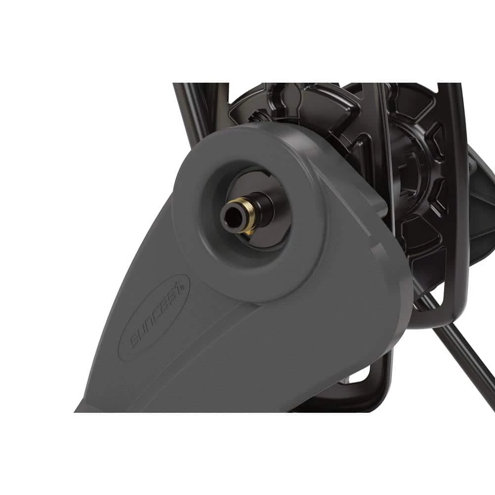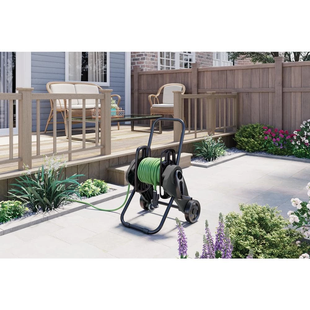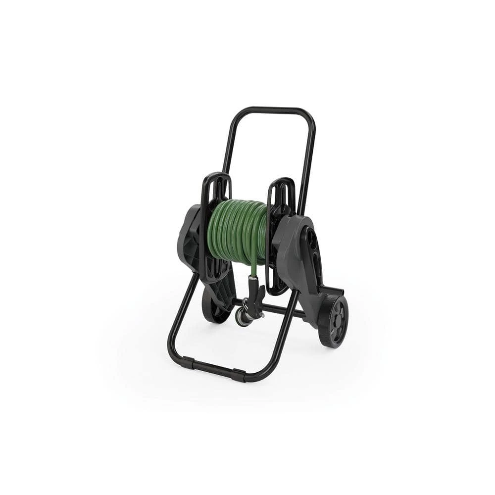 The Hybrid Hosemobile by Suncast holds up to 175 ft. of standard 5/8 in. hose reel. Its lightweight material with a fold down handle makes it easy to transport through your garden and provides compact storage for winter. Leader hose and hybrid brass in/out tube are included. Constructed of durable steel and recycled resin, this sustainable handy hose reel is easy to maintain. For more information on how to recycle this product at end of life, visit our FAQ page on our website.