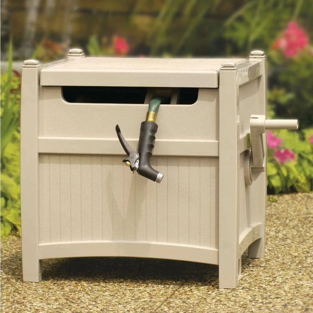 The attractive design of this hose reel fully conceals hose and reel. The easylink system ensures a watertight connection between hose reel and hoses. The Slide Trak hose guide makes winding and unwinding the hose easier. The Hose Hideaway holds 225 ft. of standard 5/8 in. garden hose. Leader hose included.