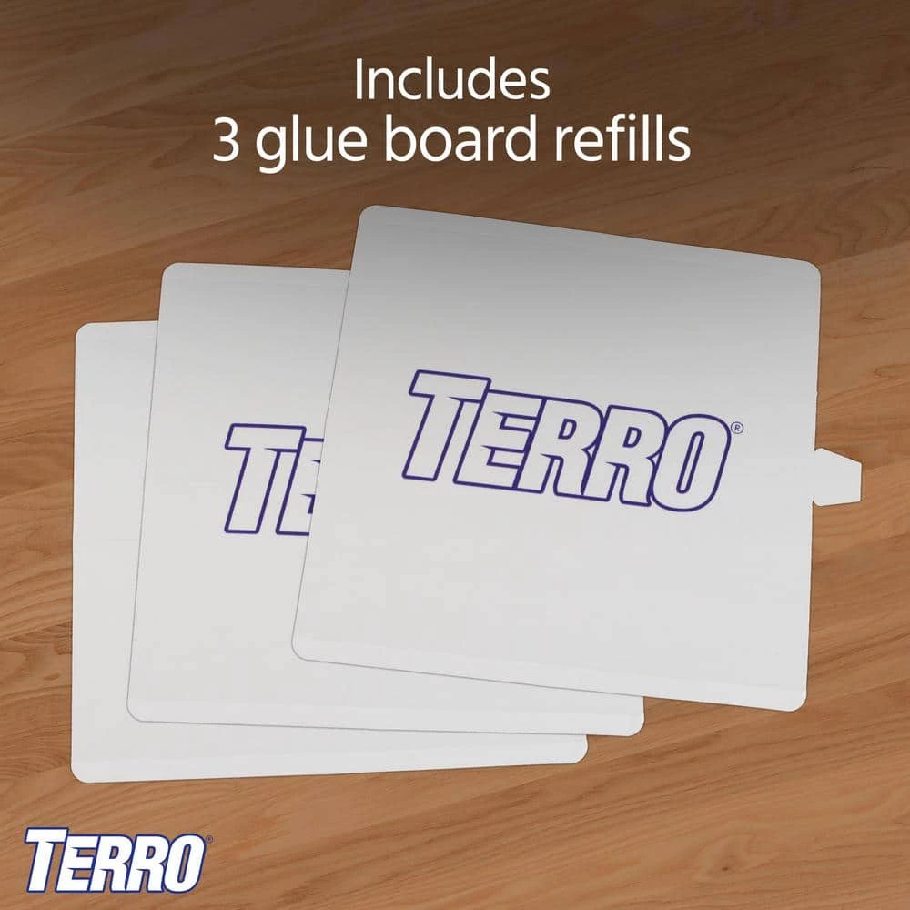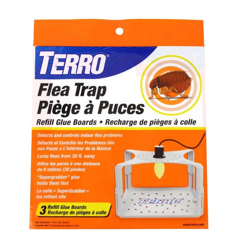 Monitor flea infestations year-round, TERRO Refill Glue Boards allow you to always have a fresh 1 on hand for your TERRO Flea Trap. Fleas leap into the trap where they get stuck fast on a SuperGrabber glue board. The glue boards will also capture other insects that attempt to cross its path. Put in a fresh glue board every 2-weeks to 4-weeks, or when the glue board becomes full. To replace, simply insert a new glue board into the trap, glue side up. Then remove the release paper to expose the glue. Finally, dispose of the old glue board. This pack includes 3 glue board refills.
