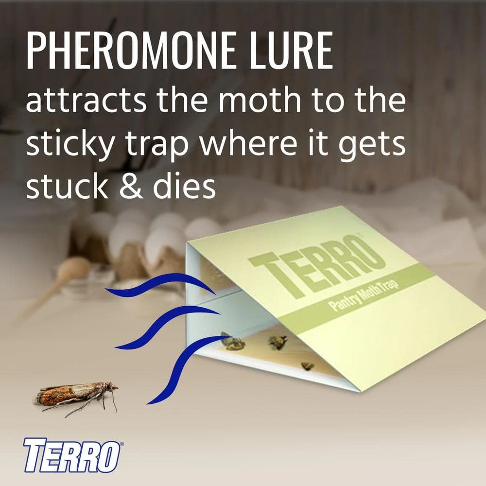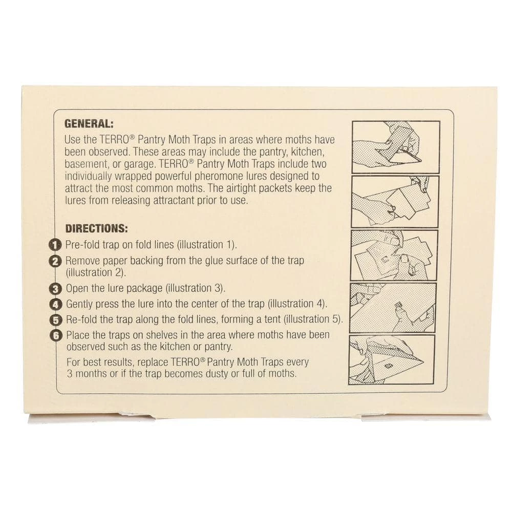 Keep grain-loving pests out of your pantry with safe Terro Pantry Moth Traps. These easy-to-use, non-toxic glue traps attract and kill the most common moths. The moth traps contain a powerful pheromone lure that attracts moths to the trap’s sticky surface where they get stuck and die. Each Terro Pantry Moth Trap package includes two glue traps and two individually wrapped pheromone lures. Use one lure for each trap by gently pressing the lure into the center of the trap, and then place the trap in areas where moths are observed swarming. For best results, replace the traps every three months or sooner if the trap becomes dusty or full of moths.