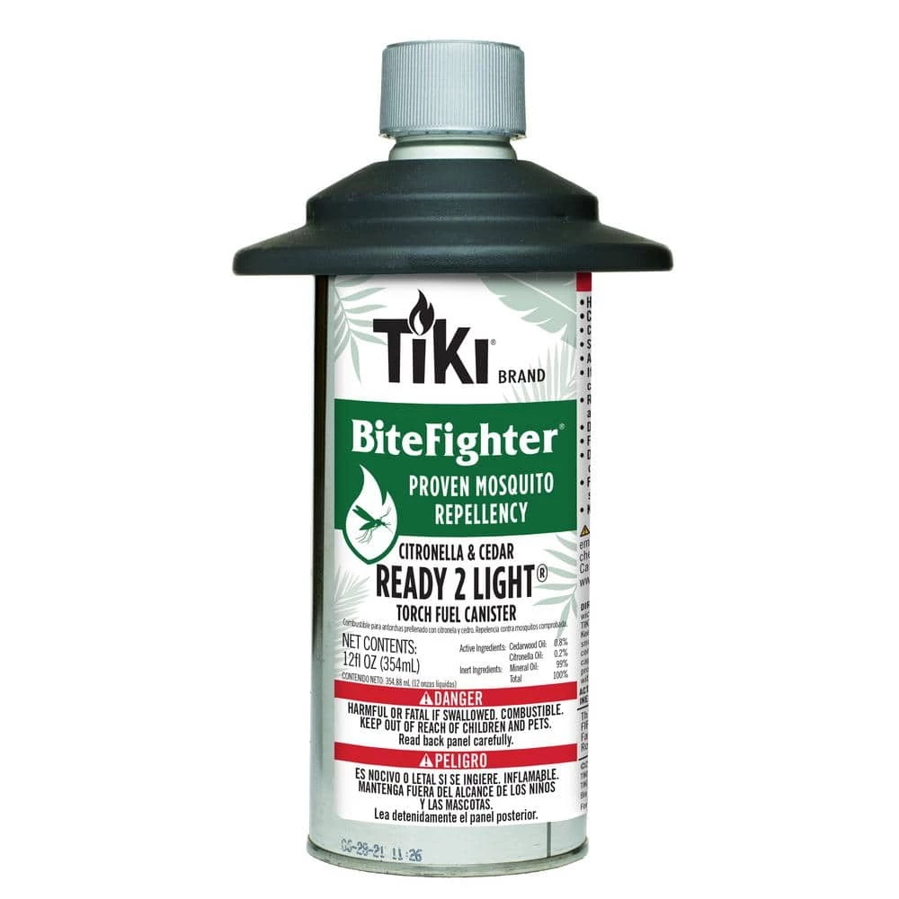 The citronella and cedar formula of TIKI Brand Ready 2 Light BiteFighter Torch Fuel provides proven mosquito repellency*. The convenient, prefilled canister fits most TIKI Brand torches and lasts up to 5 hours. Simply remove the cap, ensure 3/4 in. of wick shows at the top, place the canister in the torch, light and enjoy a fun backyard or patio experience with relaxing natural flame ambiance. When the canister is empty, dispose of and replace with a new TIKI Brand Ready 2 Light canister. TIKI Brand Ready 2 Light canisters are not refillable. *Based on studies using CO2-emitting mosquito traps which demonstrated over 50% reduction in captured mosquitoes compared to untreated controls. Use as directed. Efficacy may be affected by weather conditions, torch placement, and individual physical factors.