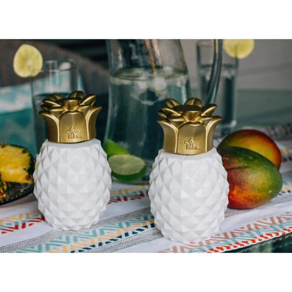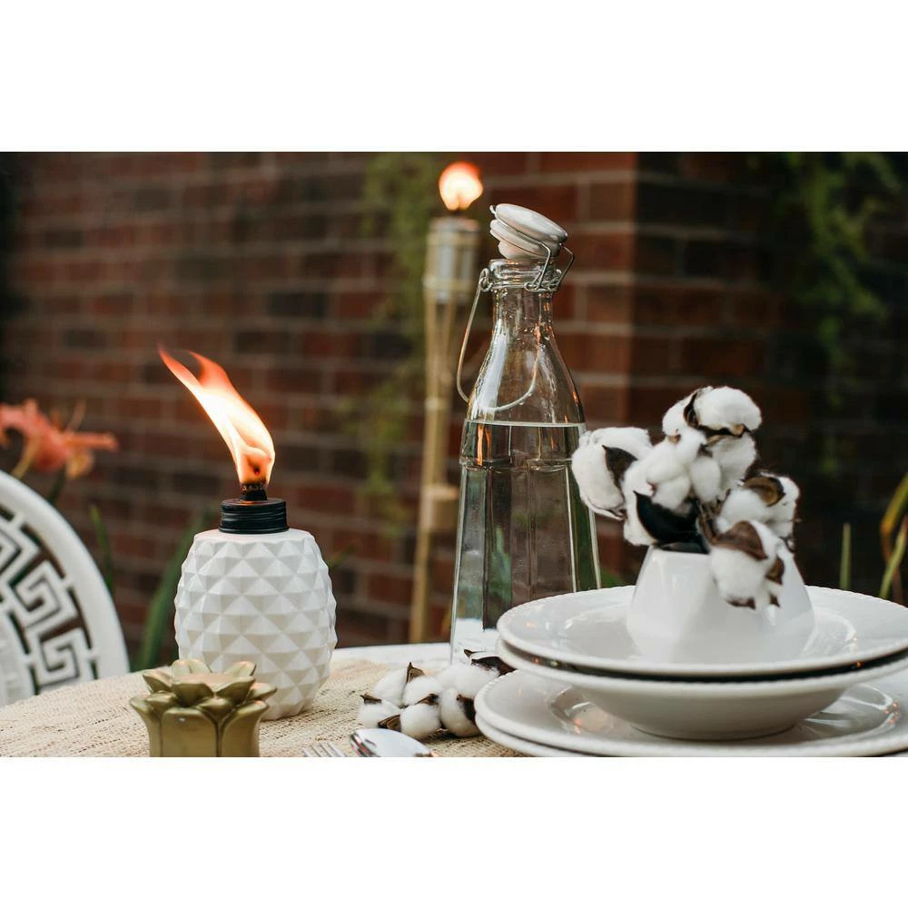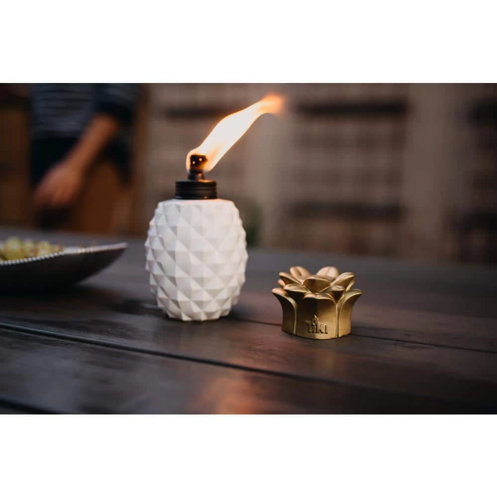 Summertime in your backyard is meant to be enjoyed with family and friends. And there’s nothing that says welcome to my backyard like the natural flame ambience of the TIKI brand Pineapple Paradise Table Torches. This 3 pack is the perfect accessory to set the mood for quality family time and provides a fashionable and friendly touch to any table setting. Its inviting decorative white glass design blends seamlessly with any decor and the integrated gold pineapple leaf-design snuffer makes it an attractive accent piece day or night. Fill with TIKI brand BiteFighter Fuel for proven mosquito repellency and up to 6 hours of burn time with each 13.5 oz. fill. The 3 pack of TIKI brand Pineapple Paradise Table Torches comes complete with a long-lasting wicks and decorative snuffers to safely extinguish the flame once the night ends. TIKI brand BiteFighter Torch Fuel sold separately.