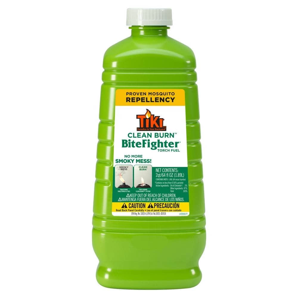 TIKI Brand Clean Burn BiteFighter Torch Fuel is the ultimate torch fuel offering proven mosquito repellency with dramatically less soot and smoke than traditional torch fuels. A cleaner alternative to petroleum-based torch fuels, this torch fuel is 85% plant based. Stay outside longer with family and friends, but keep away invited guests who buzz and bite. One 64-ounce bottle can fill five 12 oz. torch fuel canisters. Ideal for use with all TIKI Brand torches and table torches, and now comes in an Easy Pour bottle for fewer spills and less mess.