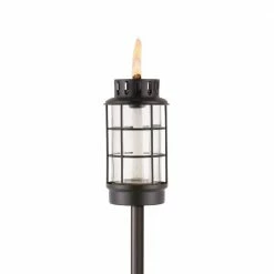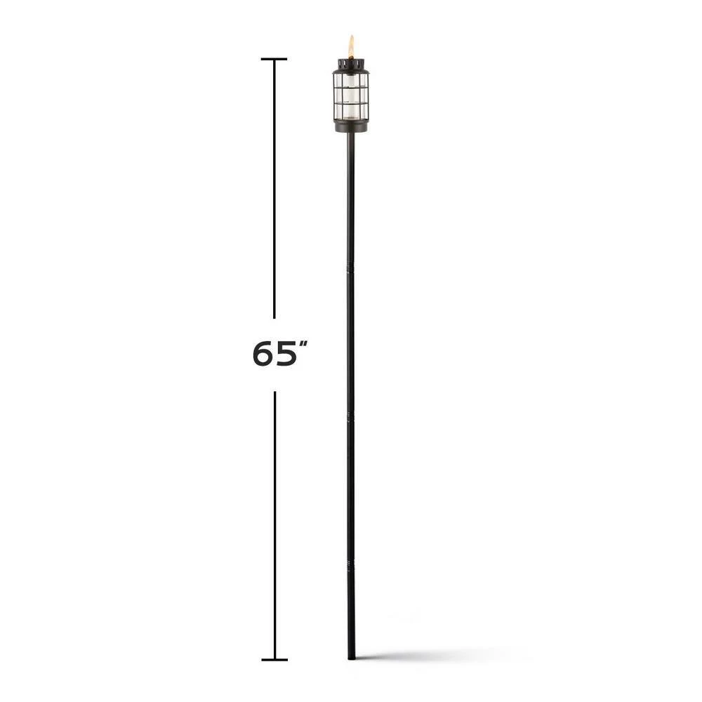 Easily add light to your yard, garden or table and enjoy natural flame ambiance in your backyard with the TIKI Brand Easy Install TIKI Torch Metal Lantern in Black. The easy install lever provides a simple, 1-step installation. This versatile torch is easy to put in and transforms from a 65 in. full-size torch to a 50 in. mid-size garden torch. Remove the metal pole completely, and it becomes a centerpiece for your outdoor dining table or end table. The glass vessel features a wide mouth for fewer spills and less mess when refilling. The TIKI Brand Easy Install TIKI Torch Metal Lantern comes complete with glass vessel lantern design with flameguard, 4-piece pole with easy install lever, long-lasting wick and a metal snuffer to safely extinguish the flame. For proven mosquito repellency, use with TIKI Brand BiteFighter Torch Fuel, and enjoy up to 5-hours of burn time with each 12 oz. fill. TIKI Brand BiteFighter Torch Fuel sold separately. Based on studies using CO2-emitting mosquito traps which demonstrated over 50% reduction in captured mosquitoes compared to untreated controls. Use as directed. Efficacy may be affected by weather conditions, torch placement, and individual physical factors.