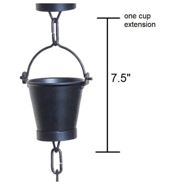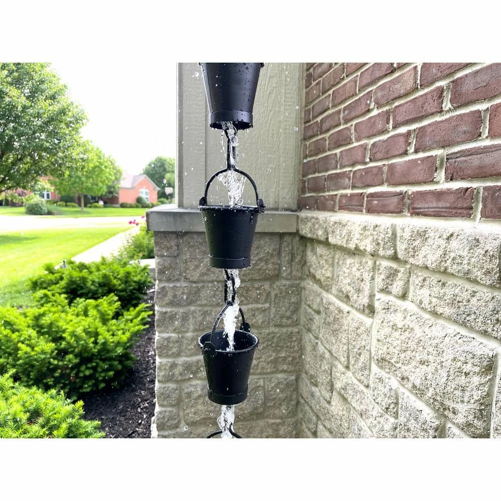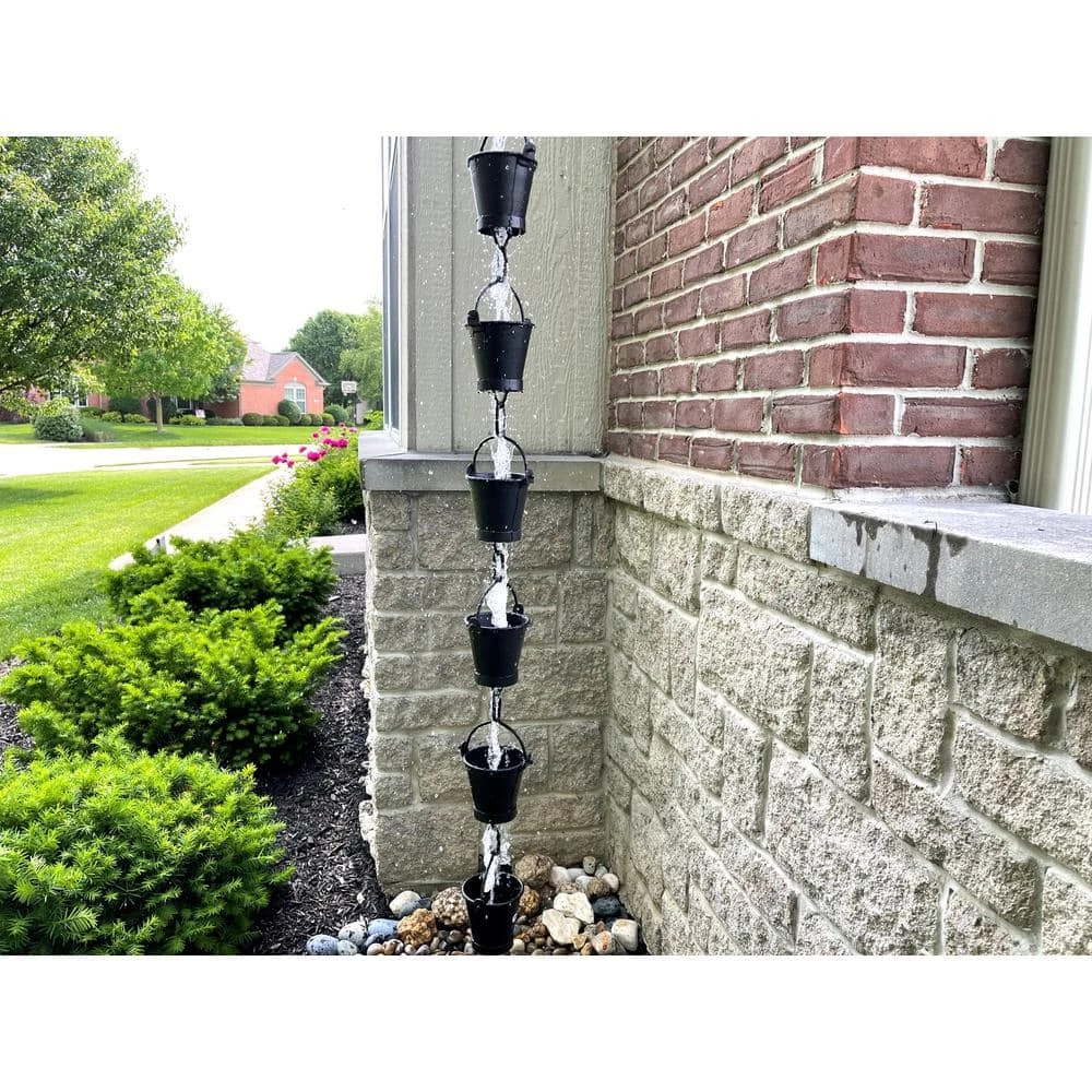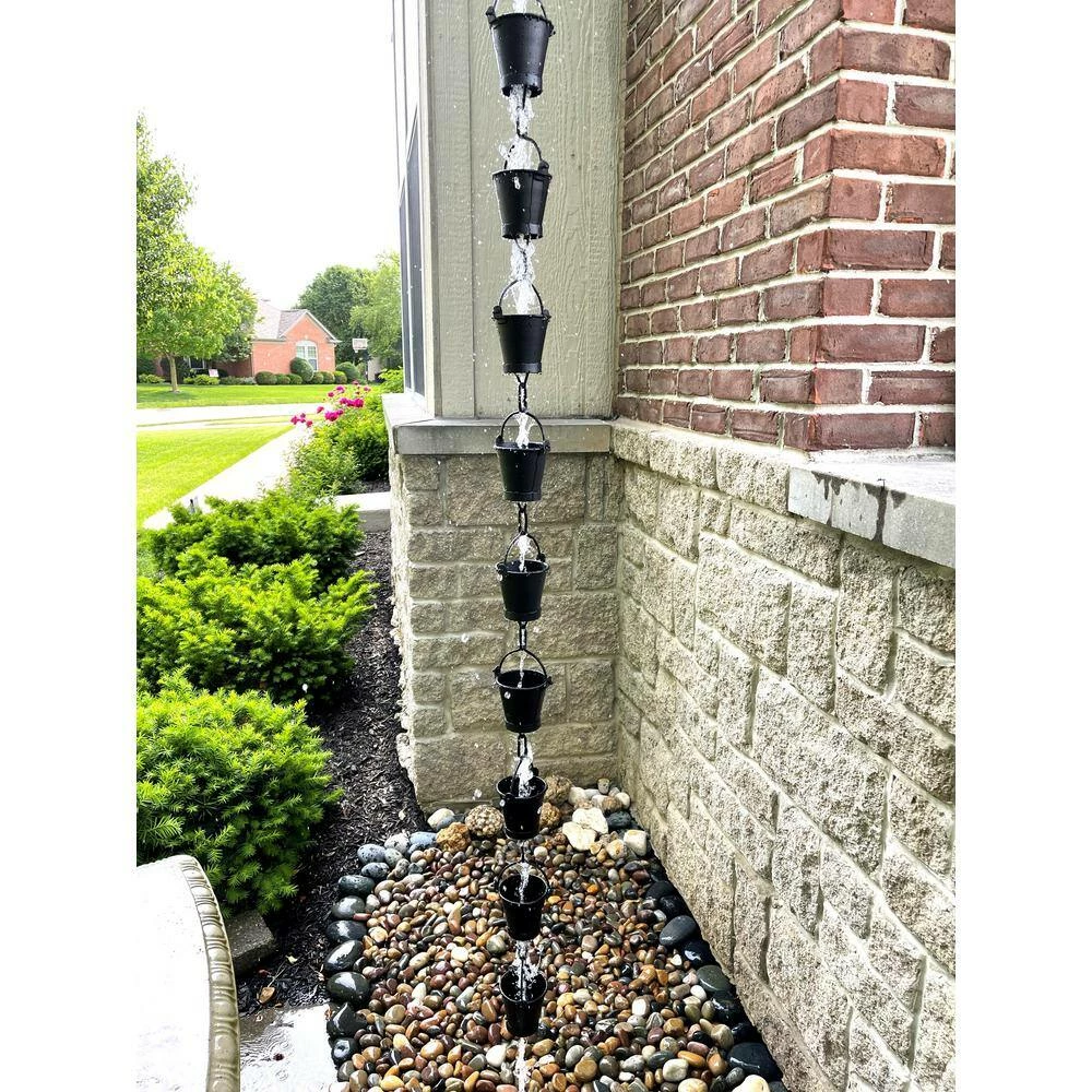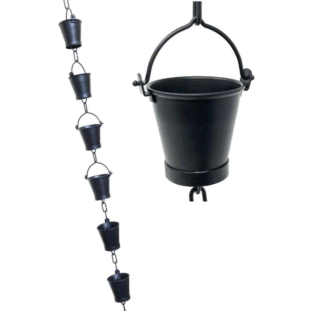 - RAIN CHAINS look great work great and sound great! No more boring downspouts! Install one of these at your front porch or backyard for added curb appeal. This rain chain features farmhouse classic bucket cup, black powder coated aluminum, heavy duty metal and detail oriented craftsmanship. Imported from India.