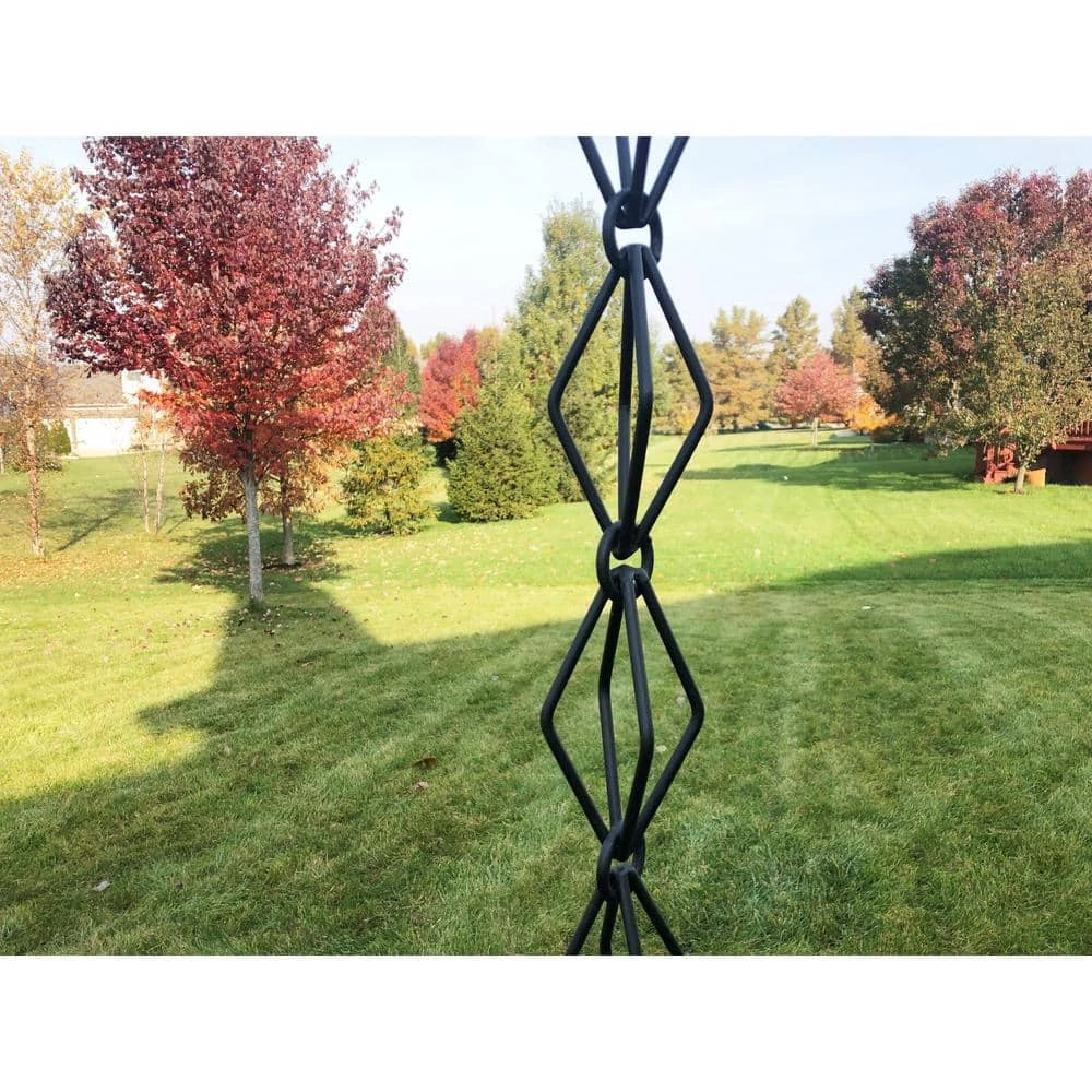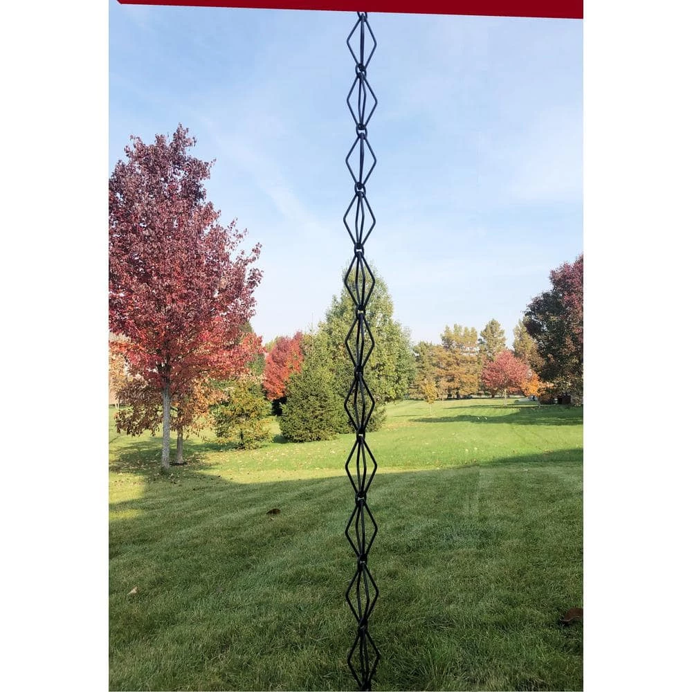 - RAIN CHAINS look great work great and sound great! No more boring downspouts! Install one of these at your front porch or backyard for added curb appeal. This rain chain features diamond shaped links made of 6 mm aluminum wire, black powder coated, heavy duty material and detail oriented craftsmanship. Imported from India.