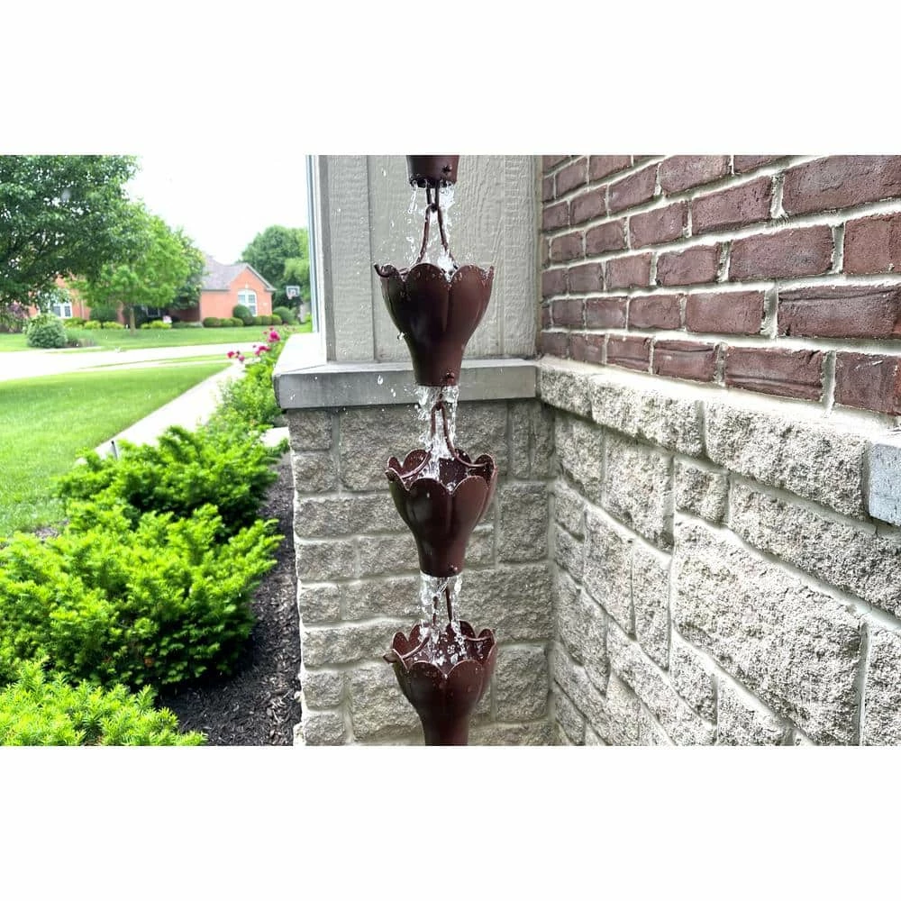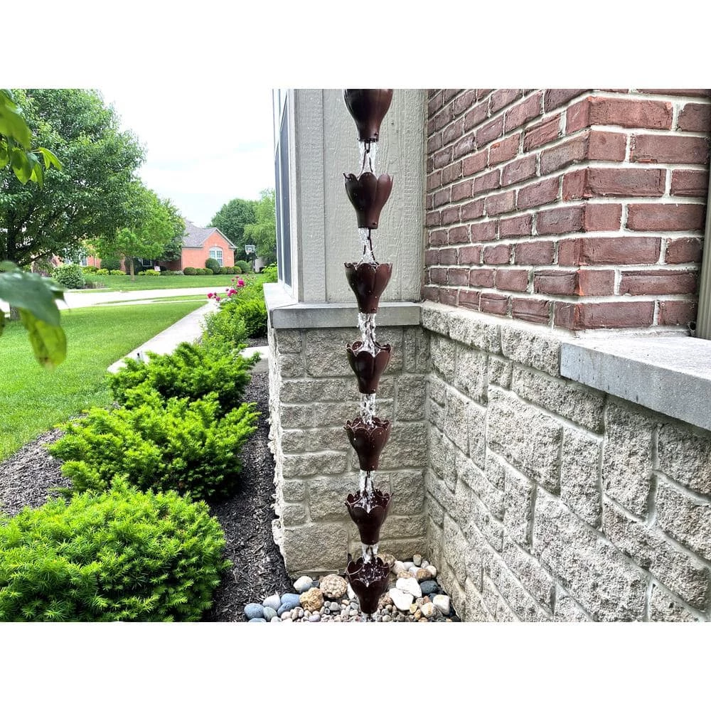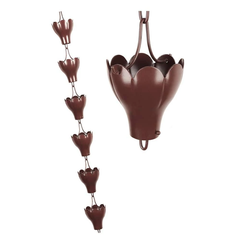 - Rain Chains look great work great and sound great! No more boring downspouts! Install one of these at your front porch or backyard for added curb appeal. This classic charm rain chain features bronze color, powder coated heavy duty aluminum and detail oriented craftsmanship. Imported from India.
