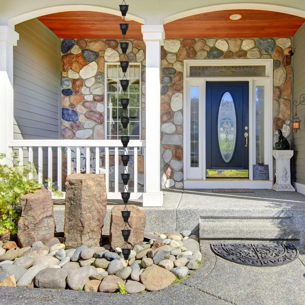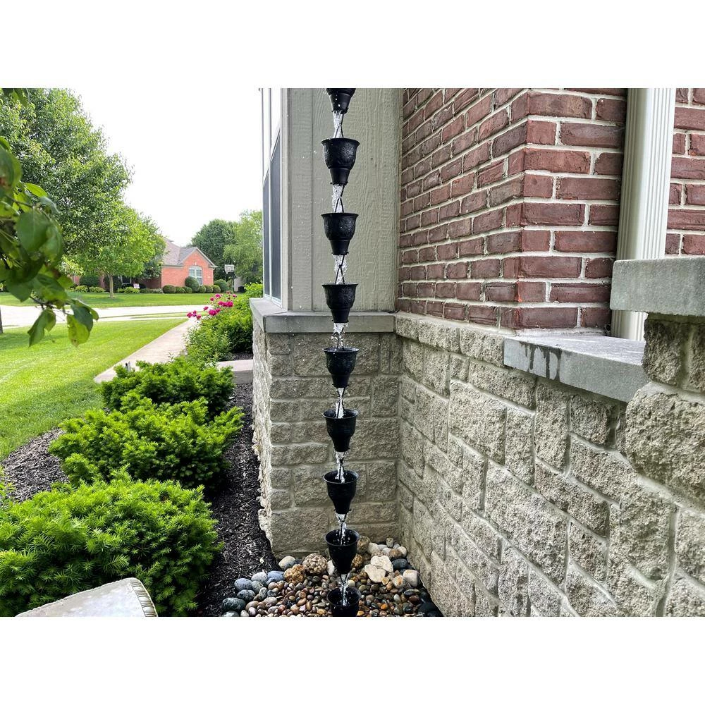 Be bold. Be creative. Replace your traditional downspout with this elegant yet functional black powder coated aluminum rain chain that guides the rain water down while creating soothing rain sound. This rain chain will add a focal point to your water garden and be the envy of your neighbors. U-nitt introduced its name to North America in 2007, with innovation, quality and selection. In the past 5-years, U-nitt discovered the beauty of these Japanese old tradition garden rain chains and redesigned them to work with our rain gutter systems and weather elements with added functionality. Each U-nitt rain chain measures 8.5 ft. L with a V clip included for easy DIY installation. Please note the ladder is not included. Copper or aluminum rain chains are made from heavy gauge metal sheets. Links/cups are removable for adjustable length. Please contact U-nitt for cup extension services, parts, comments or questions. Please rest assured that your purchase is backed with our 1-year manufacturer warranty.
